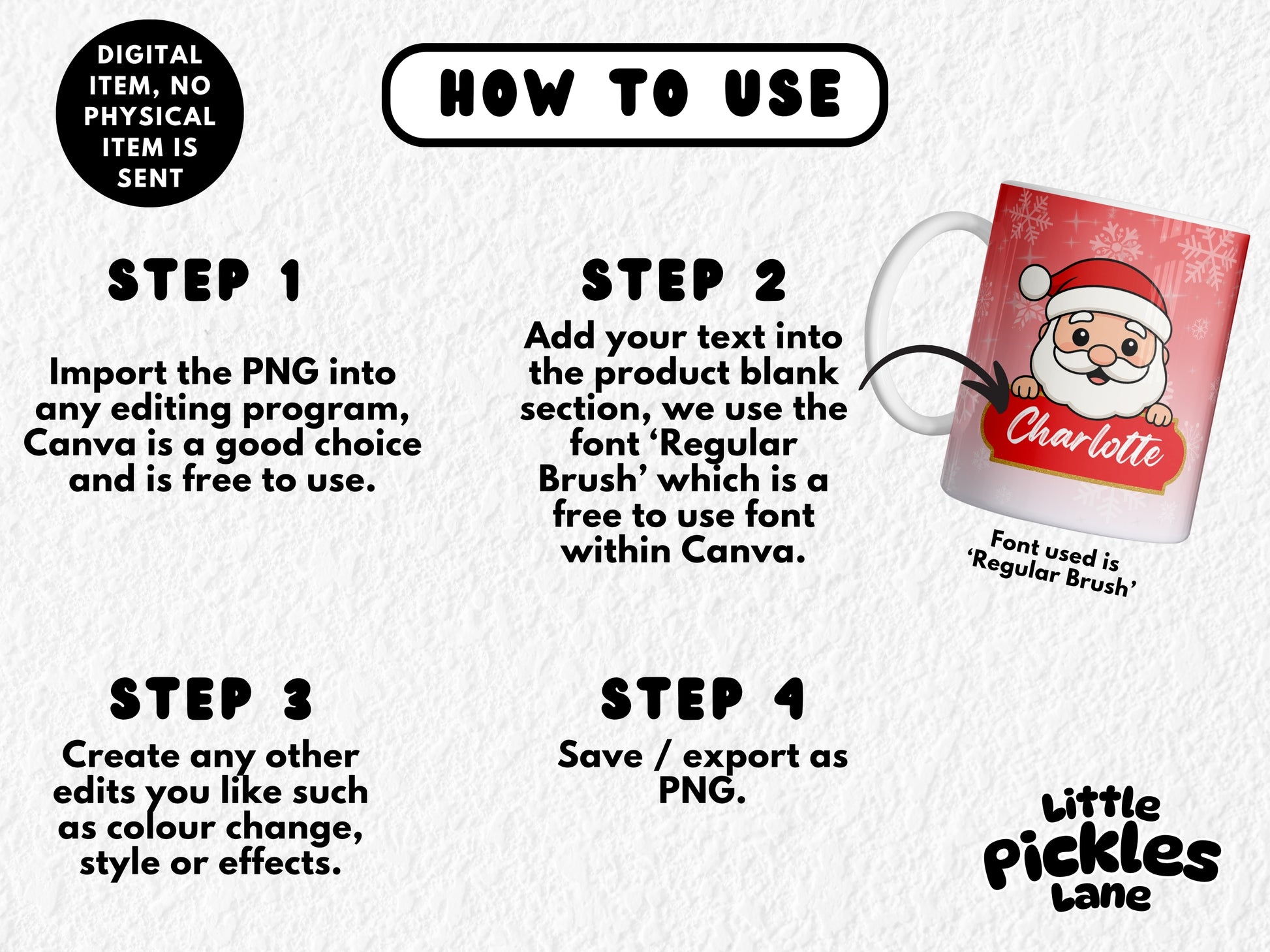 Design files do not have a name in place, please use any editing software or website to add in your names (Such as Canva). We have used the fond 'Regular Brush' for our mockup image.